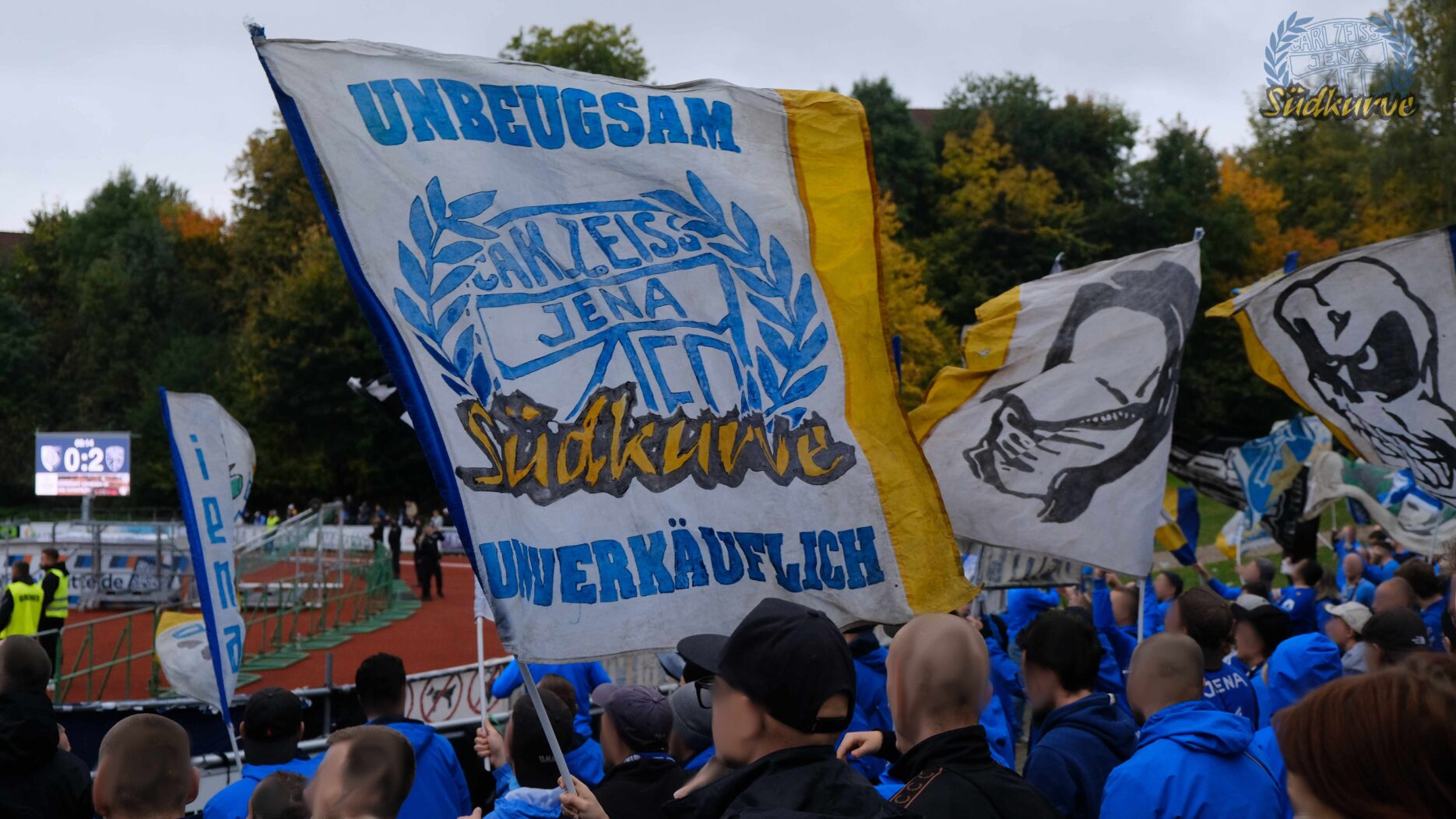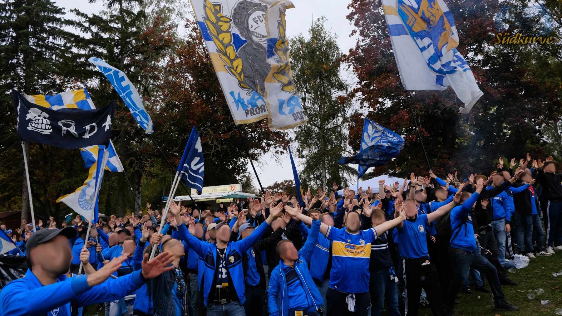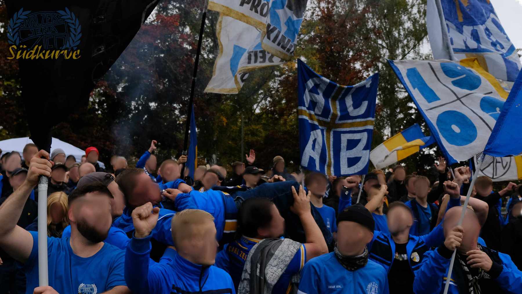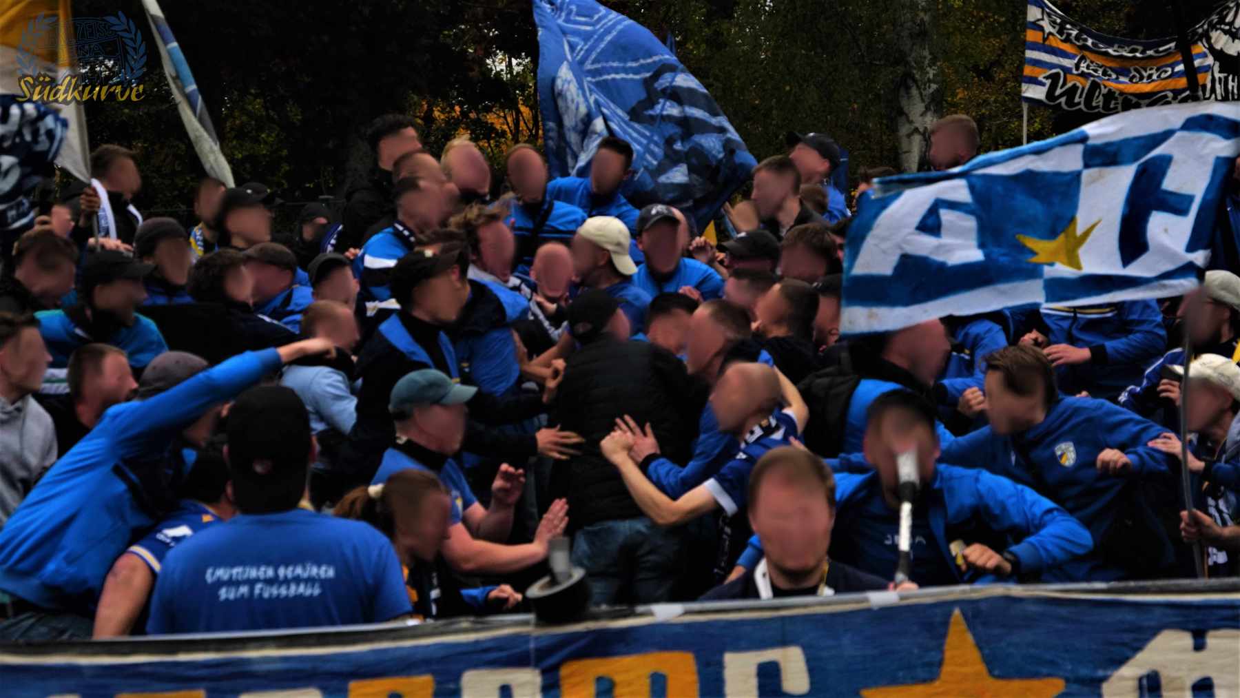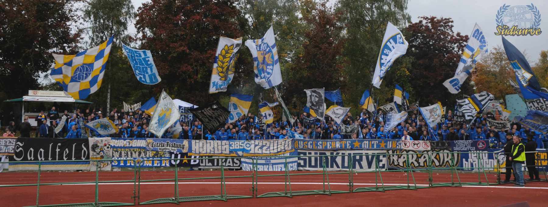 Die Wichtigkeit des Wettbewerbs zum einen und das zu keiner Zeit angebrachte Unterschätzen von Gegnern wie dem 1. SC Heiligenstadt war der Gesamtzahl mitgereister FCC-Fans nicht abzulesen. Nur ganz wenige Blaugelbweiße tummelten sich außerhalb der ca. 250 singenden Schlachtenbummler. Daher fällt das Gesamtfazit zweigeteilt aus: ausgelassener Tifo hier, zu wenig Motivation und Reisebereitschaft da. Ob es nun die Fernduelle mit dem Feind, die sich schnell als Stolperstein entpuppenden Landespokal-Gegner oder aber schlicht und einfach die besonderen Momente der Pflichtspiele in eher selten besuchten Stadien sind: rafft Euch wieder auf Zeisser – fahrt die Pokalspiele! Alle!