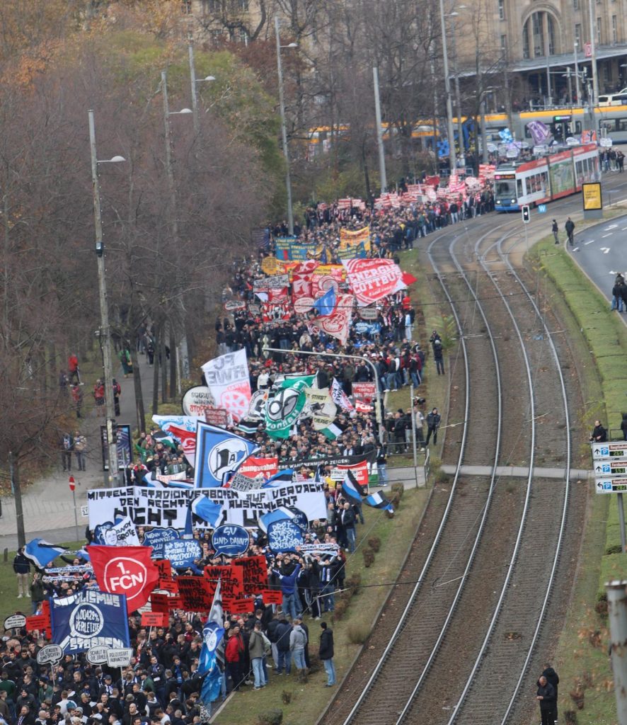 Wir können stolz auf uns sein! Innerhalb einer Woche und mit lediglich dreitägiger öffentlicher Mobilisierung haben wir es gemeinsam geschafft, ein mehr als deutliches Statement in Richtung der Innenminister, Verbände und Vereine zu setzen. Unsere Erwartungen zur Demo wurden massiv übertroffen, über 20.000 Fußballfans sind über Rivalitäten hinweg Seite an Seite durch Leipzig gezogen und haben eine klare Botschaft gesendet: Gegen populistische Forderungen der Politik und gegen die Erfüllungsgehilfen in den Verbänden – Für die lautstarke, kreative und einzigartige Fankultur in Deutschland!