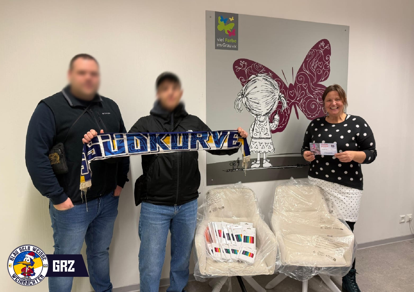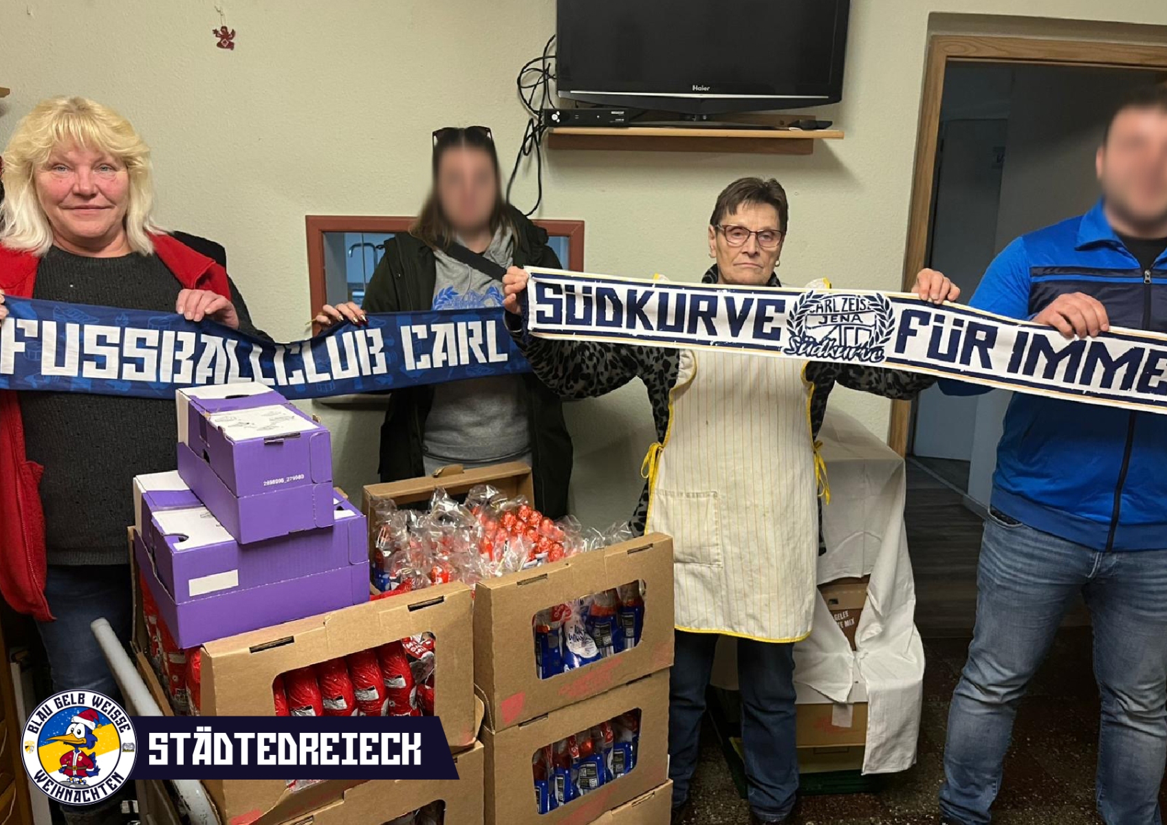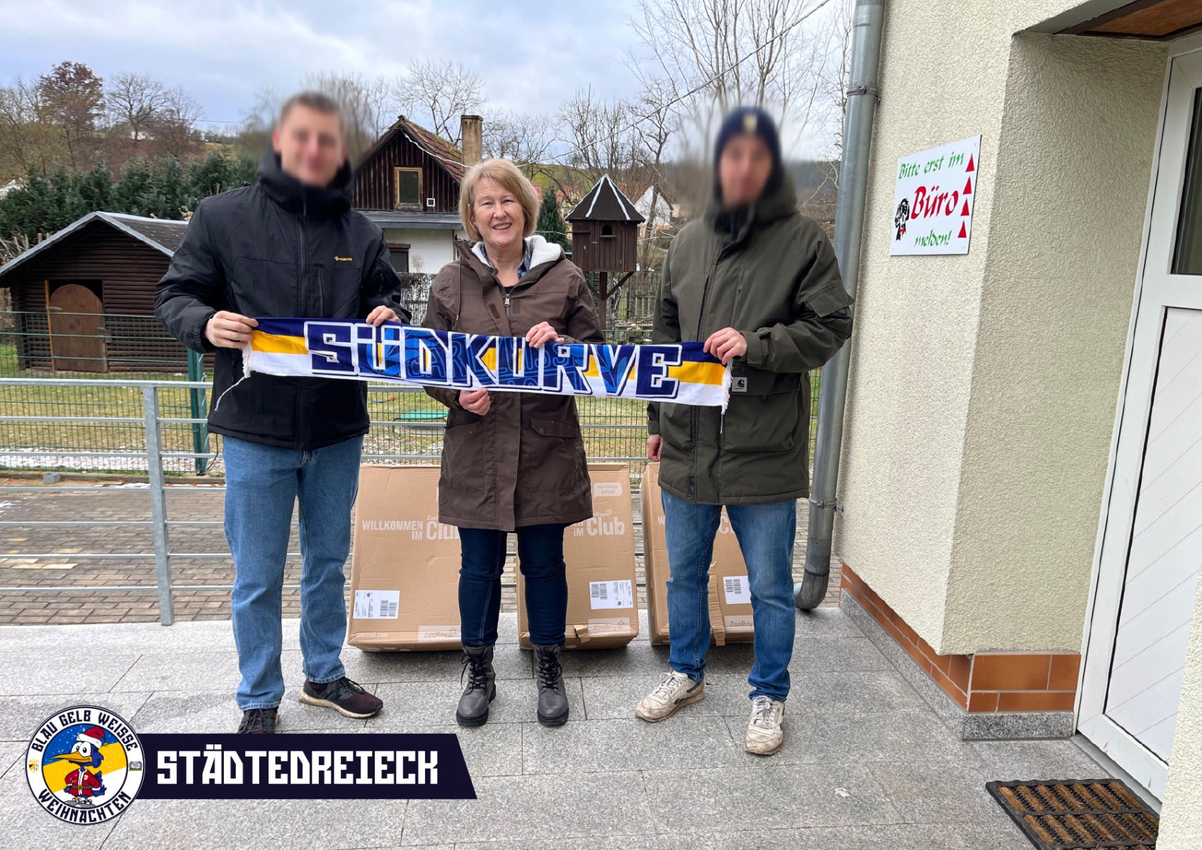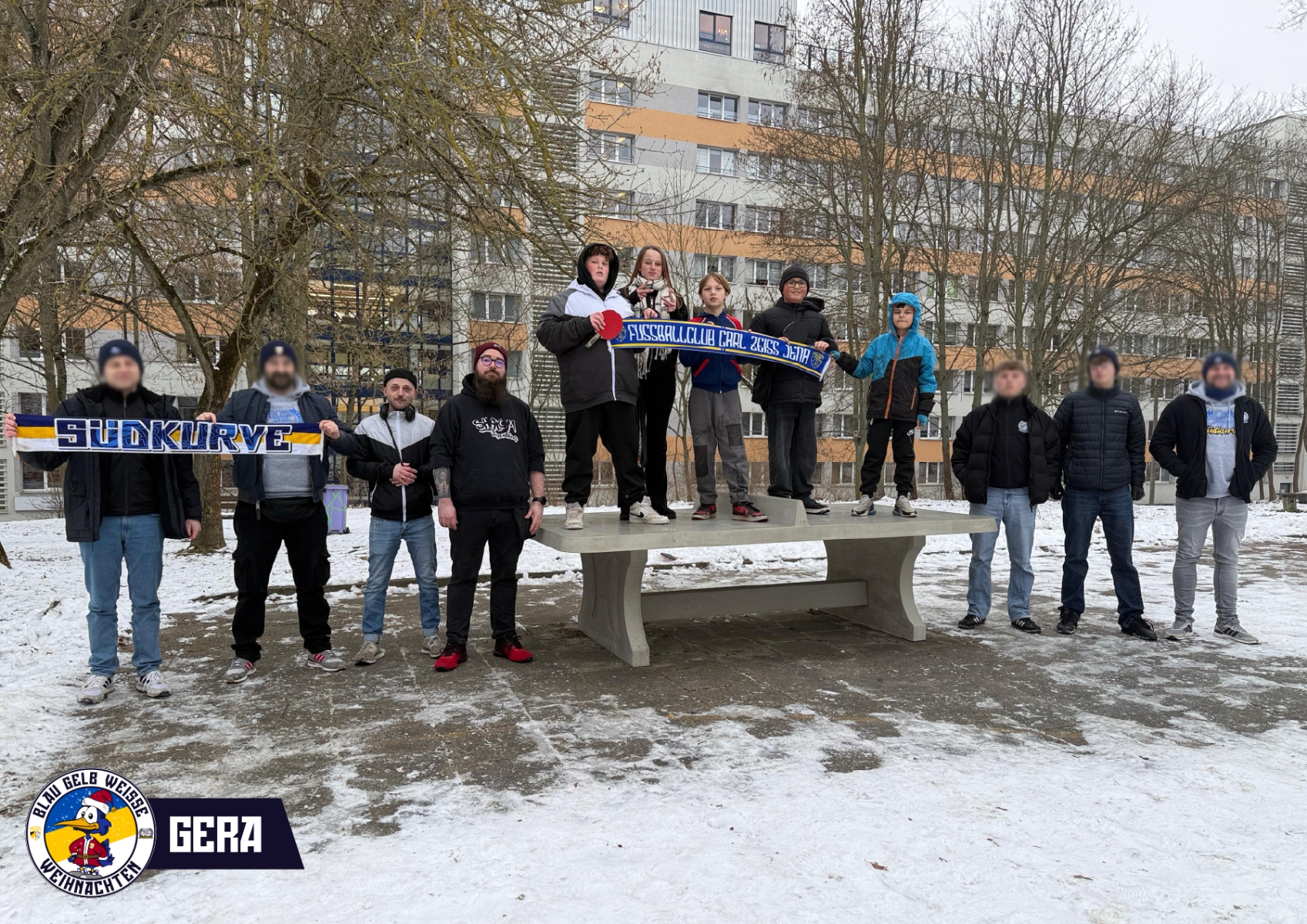 Ab Mitte November sammelten wir auf vielen Wegen Spenden: Beim Heimspiel gegen den HFC führten wir vor dem Spiel eine Spendensammlung im ganzen Stadion durch. Zwei Wochen später veranstalteten wir vor dem Heimspiel gegen Babelsberg zum ersten Mal einen kleinen Weihnachtsmarkt mit Heißgetränken, allerhand Leckereien und verschiedenen kreativen Angeboten rund um das Fanhaus. Der Weihnachtsmarkt erfreute sich großer Beliebtheit bei allen Teilen der FCC-Fanszene und soll in der nächsten Runde auf jeden Fall wiederholt werden. Die Regionsgruppe GRZ war auf dem Weihnachtsmarkt in Weida präsent und organisierte dort einen eigenen Glühweinstand. Daneben trugen auch Onlinespenden ihren Teil zum Gesamtbeitrag bei.
